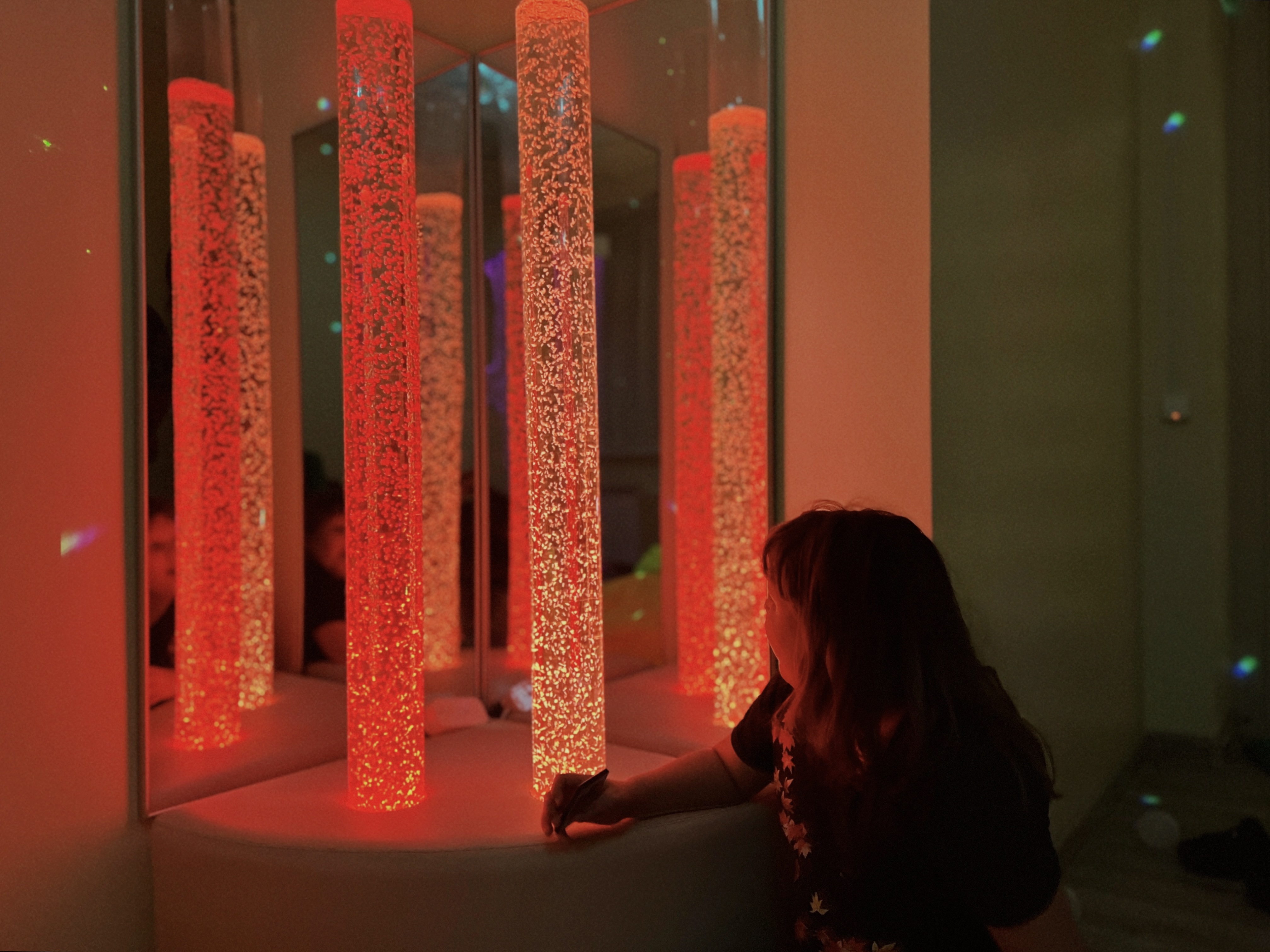Комната оборудована пузырьковыми трубами, сухим бассейном с шариками, оптоволоконным «душем», музыкальными инструментами, проектором звездного неба и зонами для релаксации.